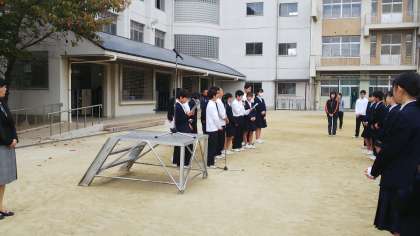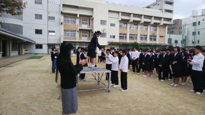 本日の全校集会では、校長先生のお話の後、生徒会各委員会からの今月の目標、挨拶運動の優秀者表彰、校訓の旗応募者の中から入賞者へのレリーフの授与が行われました。