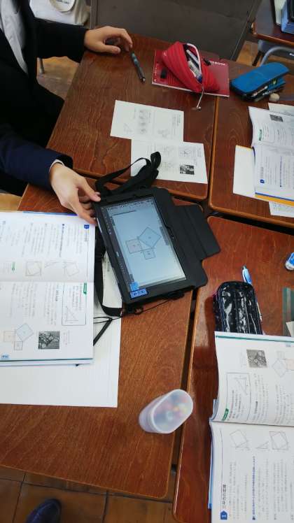 今日は、1時間目、数学の研究授業がありました。タブレットを用いて、グループでの話し合いも、活発になってきました。