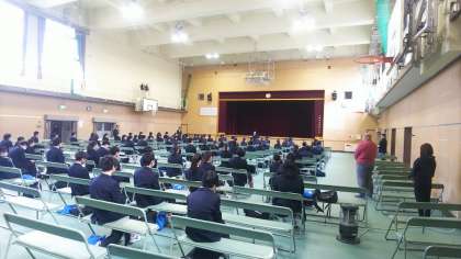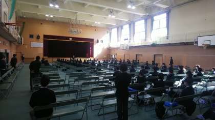 本日、登校日を設定し、修了式を行いました。体育館で学年を分けて、個々の距離を確保しながら、窓も開けての実施となりました。