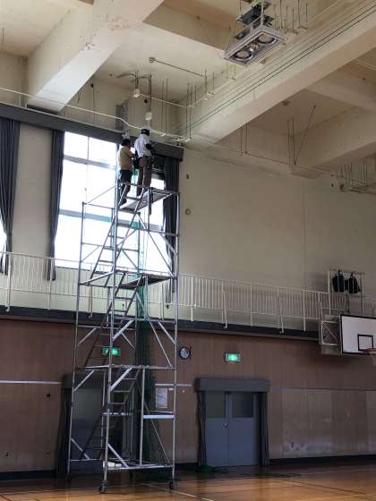 体育館中央部の防球ネットが開閉しづらい状況であったため、本日業者の方に補修作業を行っていただきました。作業前は、全体重をかけても防球ネットはほとんど動かなかったのですが、作業後に教頭先生と一緒に試してみると、簡単に動かすことができました。体育の授業や部活動時に活躍してくれることでしょう。
