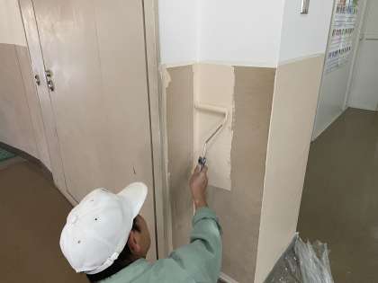 その間に管理作業員さんが1階の壁を塗り直してくれました。見違えるほどきれいになりました!!