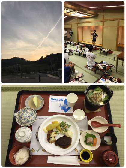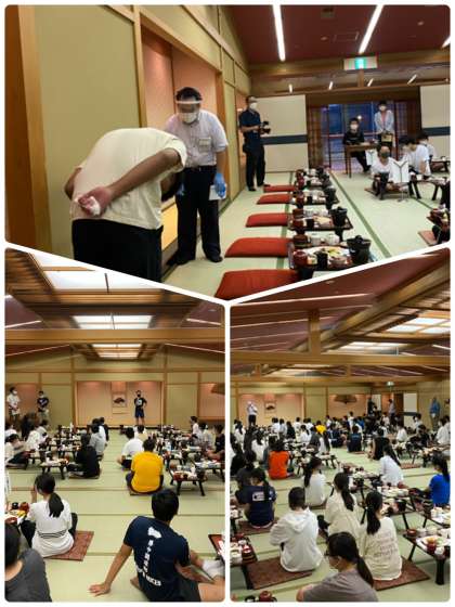 入館後、食事会場にて入館式を実施。その後、待ちに待った夕食の時間です。