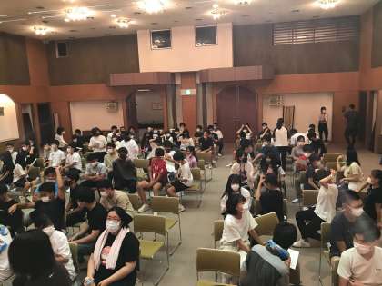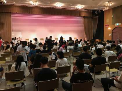 食事、入浴が終わり、待ちに待ったレクタイム。会場も椅子を並べて準備完了。まもなく、開催です。