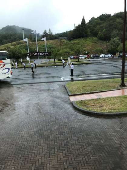 グリーンピアせとうちを出発しました。大雨の中、ホテルの方々が見えなくなるまで手を振ってくれました。本当に感謝しかないです。これより、宮島へ向かいます。