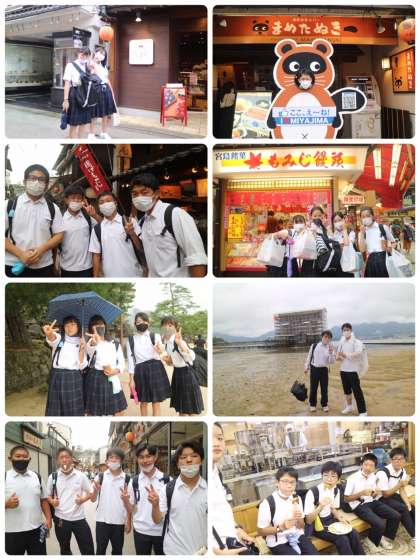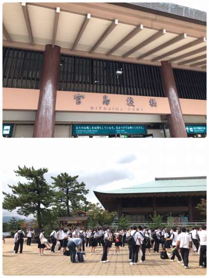 宮島の散策も終わり、乗船。天気は日差しが差して暑いくらい。散策中は少し雨も降りましたが、傘もほとんど使わず、楽しく食べ歩きすることもできました。落ち着いた雰囲気で見学し、厳島神社のお詣りをする人もいました。さあ、ここからは帰路に入ります。船、バス、新幹線、バスと乗り継いで桃谷中学校まで帰ります。気を抜かず行動してほしいと思います。