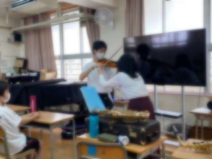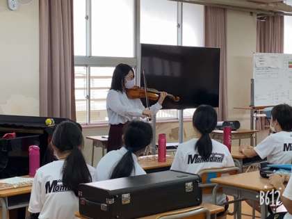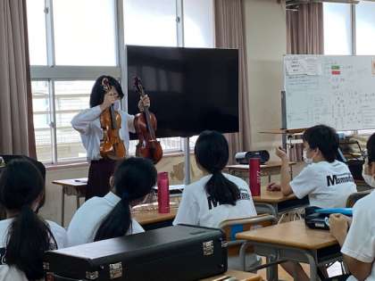 ヴァイオリンの音の出し方や、よく似た楽器であるヴィオラとの違いなどを、実際に演奏を交えて紹介していただきました。実際に見るのは初めてという生徒も多く、興味を持って話を聞けていました。