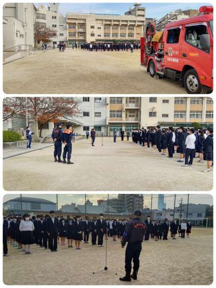 6時間目は避難訓練があり生野消防署の消防隊員の方々に来ていただき、ご助言いただきました。