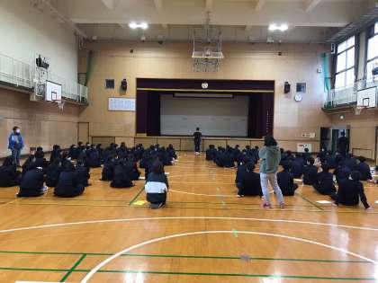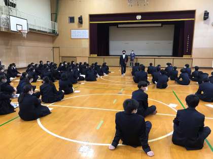 3年生は、今日の5時間目から卒業式の練習を始めました。今日は卒業式の意義の確認と座席、証書授与の所作と動きの練習でした。まだ椅子も並んでいないのでリラックスして聞いていましたが、来週からは会場も準備しての練習なので緊張するのではないでしょうか。頑張って欲しいと思います。