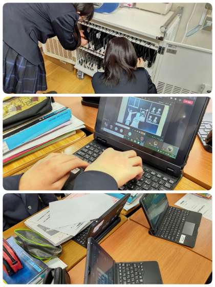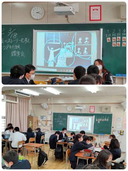 本日は美術科で研究授業を行っています。アトランダムに生徒の作品を選び、その作品がどのようなストーリーをもとに描かれているかをグループで話し合い、その結果を発表するというものでした。大変盛り上がり個性的な意見や見方の発表もありました。最後に教員が作品の解説をしたり評価をしたりTEAMSの使用の広がりを感じました。
