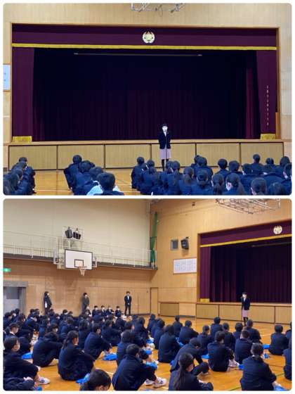 本日、令和二年度修了式を体育館で行いました。3年生が卒業して、1年生・2年生のみと、少し寂しさもありますが、この学年を終え、次の学年に向けて春期休業の時間を有意義に使ってください。