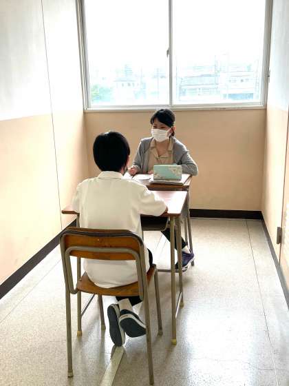 今週は総合や学活の時間を利用して、担任の先生と一対一で話をする教育相談を進めています。日頃はなかなか個人的に話をする時間がありませんが、2年生になってからの学校生活や勉強のこと、友達関係など話題は多岐に渡っているようです。これをきっかけに学年の先生や部活動の先生とも交流が盛んになるといいですね。