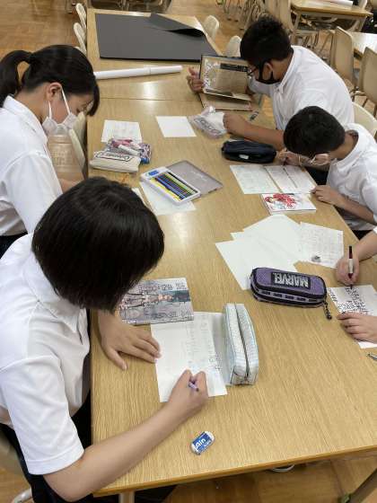 懇談期間の午後を利用して文化委員が集まっています。全校生徒にもっと本に親しんでもらうための啓発活動の一環です。先月の委員会で学年ごとに取り組む内容を話し合って決めました!