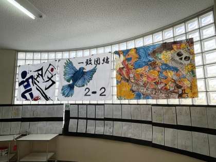 2階フロアに展示が並びました。中央のガラスブロックの部分には体育大会で作った学級旗と職業調べ新聞が展示されています。