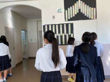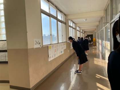 文化週間の活動として、本日2年生は5時間目に教室で、他学年の合唱を鑑賞し、6時間目は美術科の課題の鑑賞シートを持って、校内の展示作品の見学に行きました。