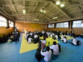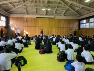 いよいよ今日から修学旅行がはじまります。無事に参加者全員が時間通りに集合し、出発式を行っています。実行委員長の挨拶では、修学旅行のテーマである「超青春!一笑懸命楽しむ3年間の集大成!」の説明がありました。みんなで楽しい修学旅行にしていきましょう!