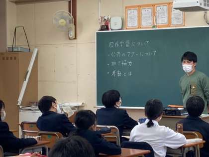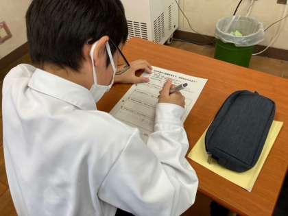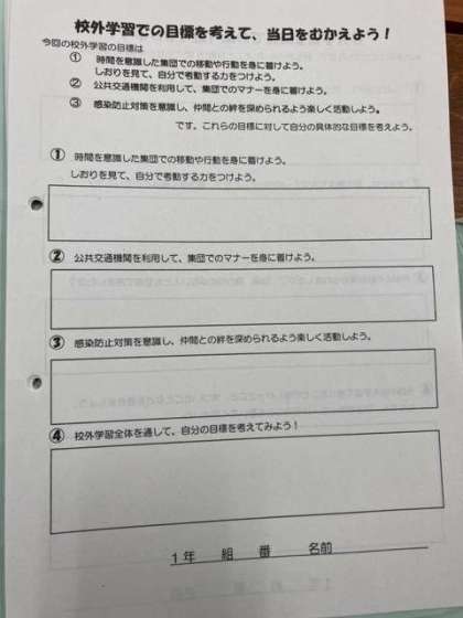 明日の校外学習に向けて、担任の先生から最後の確認のお話と学習での個々の目標を考えてもらいました。