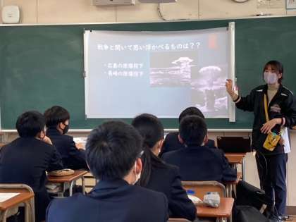 大阪大空襲での恐ろしさや被害を知り、実際に大阪城や玉造駅に残っている空襲の爪痕写真を見て学習しました。