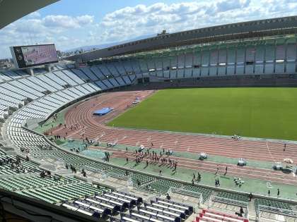 2年ぶりに大阪市陸上競技フェスタが開催されました。この大会は世界陸上大阪大会開催記念として行われるため、ヤンマースタジアムという大きな競技場が使えます。今日は気温も20度前後と心地よい晴天で、好記録が期待できるコンディションでした。