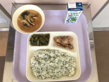 菜飯、鶏肉のしょうゆバター焼き、とうふの味噌汁、さんどまめのごまあえ、牛乳