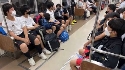 試合中の写真を撮り忘れたので、帰りの電車の写真です。多くは寝てしまってましたが、数人、まだまだ元気な1,2年もいました。5時15分ごろに鶴橋駅で解散しました。