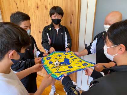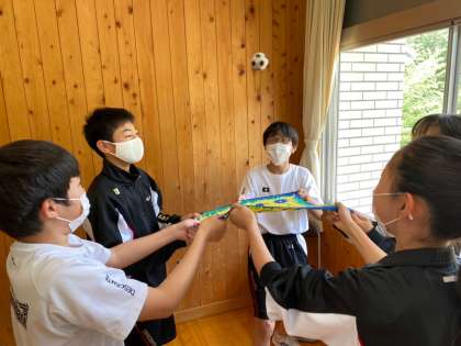 写真はバンダナリフティングです。全員がリズムを合わせて、声をかけ合うことで連続でリフティングを成功させていました。