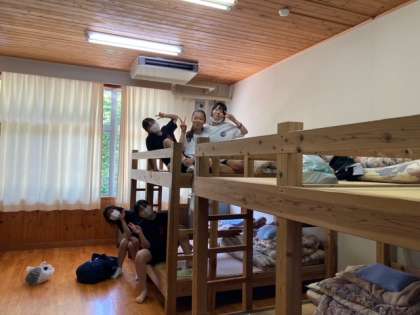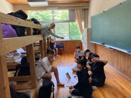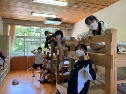 朝のつどい、朝食、掃除を終え、川遊びの準備をしています。