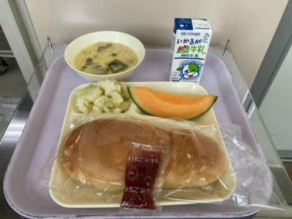 パン 牛乳 かぼちゃのクリームシチュー キャベツのゆずドレッシング クインシーメロン いちごジャム