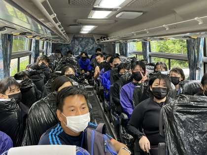 黒いビニールを敷いた座席に黒マスクをしているのは、ラフティングゴール直後。まだ興奮冷めやらぬ様子でした。いまは昼食会場に向かっているところです。車内は静か!みんな快く疲れたようです。
