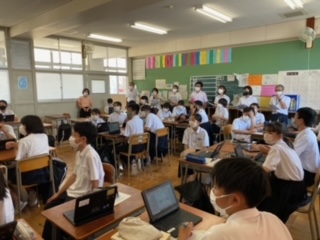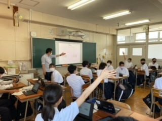 1ー2の6時間目、数学の授業の様子です。玉出中学校の先生たちが参観される中でしたが、班での取り組みも発表も、いつも通り堂々と行っていました!