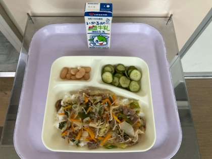 ごはん  牛乳  牛丼  きゅうりのしょうがづけ  大福豆の煮もの