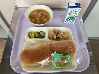 パン 牛乳 鶏肉のからあげ 中華みそスープ きゅうりとコーンの甘酢あえ りんごジャム