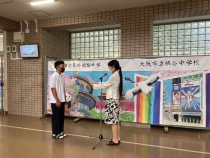 表彰伝達では、大阪市南地区1・2年生大会で優勝したラグビー部の優勝と生徒会主催のスマイルキャンペーンで活躍してくれた代表生徒が表彰されました。