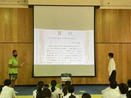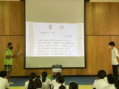 今日は吉川先生から体育大会をおえて、各クラスの表彰を行いました。