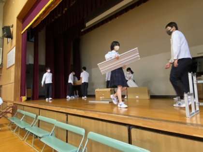 1枚目の写真は、スムーズな全体練習のために、委員の生徒のみなさんがお昼休み返上で、準備をしてくれている様子です。