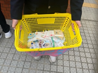 今朝は、12月の全校集会でお願いしていた、書き損じハガキと使用済み切手の回収に行ってきました。たくさんの人が、切手やハガキを持ってきてくれました。ご協力ありがとうございました。