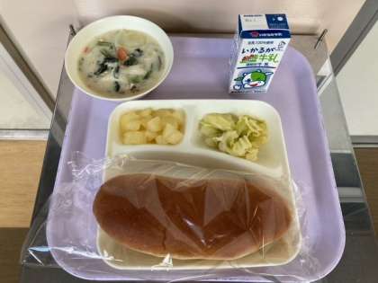 パン 牛乳 ほうれんそうのクリームシチュー キャベツのサラダ 洋なし(カット缶)