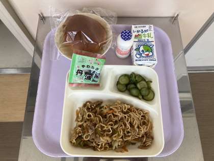 焼きそば、きゅうりのしょうがづけ、ソフト黒豆、発酵乳、パン、牛乳