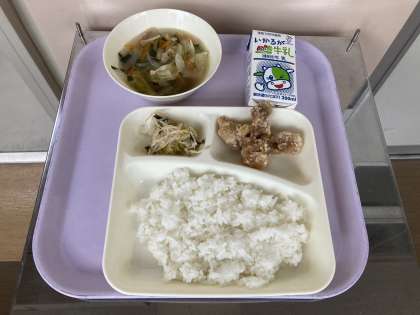 鶏肉のからあげ、中華スープ、チンゲンサイと