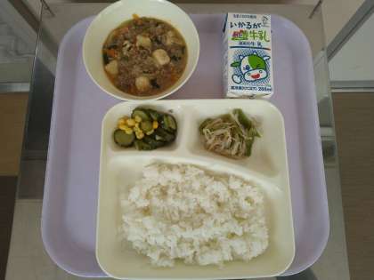 マーボーどうふ、きゅうりとコーンの甘酢あえ、もやしとピーマンのごまいため、ごはん、牛乳