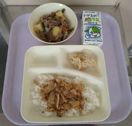 肉じゃが、もやしのゆずの香あえ、ごまかかいため、ごはん、牛乳