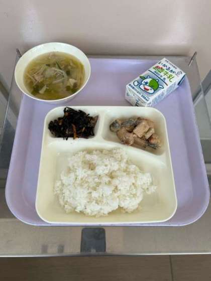 さけのごまみそ焼き、五目汁、ひじきのいため煮、ごはん、牛乳