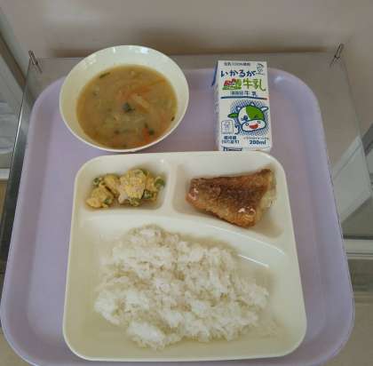 あかうおのしょうゆだれかけ、みそ汁、えんどうの卵とじ、ごはん、牛乳