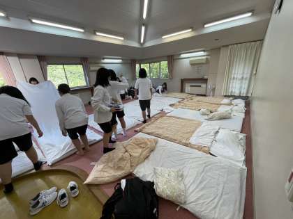 女子のフロアの様子です。お風呂に入って、部屋で布団の準備をしています。なかなか手際が良いです。