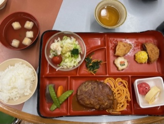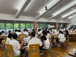 オリエンテーリングも入浴も終わり、待ちに待った夜ご飯です。みんなぺこぺこだーと言いながら食堂に集まりました。たくさんの生徒がおかわりしていて、とても賑やかで楽しい夜ご飯です。