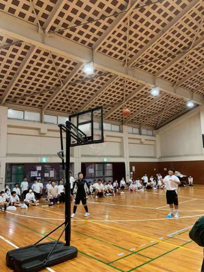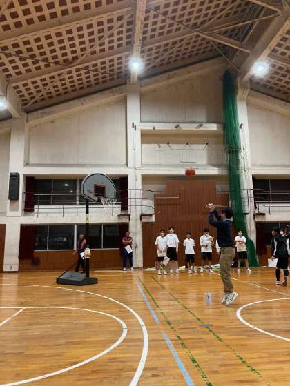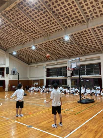 四種目めはバスケ、フリースローです。デモンストレーションは教頭先生。もちろんナイスゴール。みんなも頑張っています。