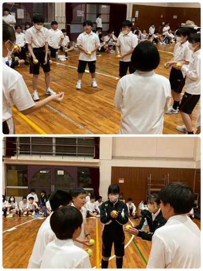 六種目めは隣の人にテニスボールを渡す競技です。円になって全員が同時に隣に投げ、落とさず受け取るのはなかなか難しいのですが、みんなよく頑張っています。