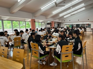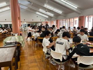 ラジオ体操の後は朝ごはんです。山盛りのご飯をおかわりする生徒がたくさんいました。しっかり食べてこの後の野外炊飯も元気に取り組みましょう。