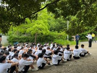 1泊移住ももう終盤です。退所式では生徒を代表して、4組の委員長さんが大阪府立少年自然の家の方に感謝の言葉を述べてくれました。入所式に比べると、整列も集合もかなり素早く、静かにできていました。2日間の成長が見えますね。自然の家のみなさん、本当にありがとうございました。