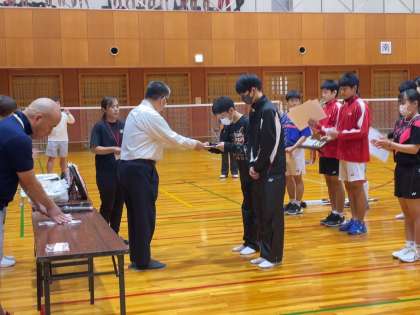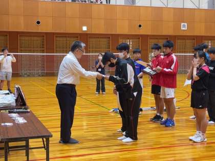朝は5月に行われた個人戦で3位に入賞したダブルス2ペアが表彰されました。