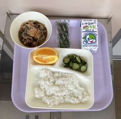 すき焼き煮、きゅうりのしょうがづけ、オレンジ、焼きのり、ごはん、牛乳